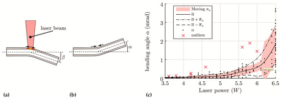 The laser-assisted bending of micro-tubes provides a potential, for example, for the positioning of optical fibers with respect to a waveguide chip, where a submicron alignment is required [96]. In this type of bending process, the tube is heated locally on one side by the laser radiation, which results in a local thermal strain in the tube wall. This strain introduces a compressive stress that exceeds the yield strength and, through this, generates a compressive plastic strain, as shown in Figure 10a. When the tube cools down, the heated area will effectively contract, and the result is a bending of the tube toward the laser, as shown in Figure 10b. In [96], an experimental setup was presented for the bending of stainless-steel tubes, with do = 635 µm and t = 153 µm, with a real time measurement of the tube deformation. A laser source, with a wave length of 1080 nm, was used in these experiments, with a focused spot size of the laser beam of 400 µm. The selected laser power was between 7 and 10 W. The bending of micro-tubes made from stainless steel, with outer diameters between 457 and 711 µm, was investigated [97], and it was shown that it was possible to align an optical fiber, with an accuracy of 0.1 µm, although the laser forming process caused a significant scattering in response to the bending angle and direction [97], as shown in Figure 10c. A self-learning algorithm was proposed and tested within the frame of this research, which determined for each bending step the most suitable values of the main parameters: the axial laser spot position on the tube and the laser power [97].