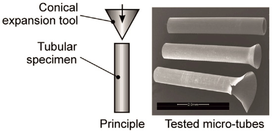 - Furushima, T.; Manabe, K.; Sakai, T. Fabrication of Superplastic Microtubes Using Dieless Drawing Process. Mater. Trans. 2008, 49, 1365–1371. [Google Scholar] [CrossRef]