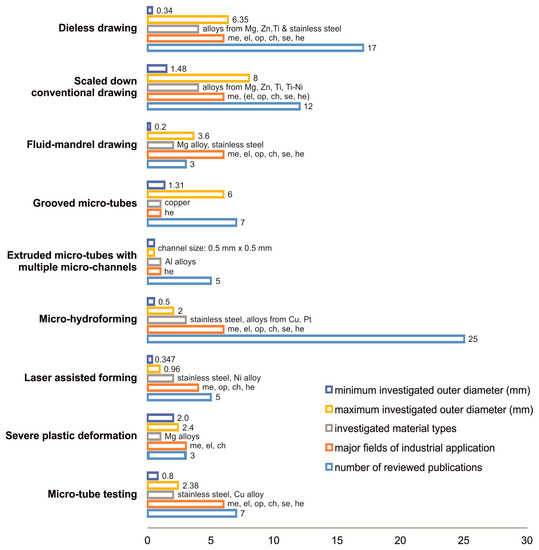 These issues also apply for micro-tube forming techniques, as tubular micro-components play an important role in a broad range of industrial products for economically significant markets. Products based on micro-tubes and tubular micro-components can be found, for example, in the fields of medical engineering, electrics and electronic systems, optoelectronics, chemical systems, sensors, and thermal management, as summarized in Table 1 from [5,6].
