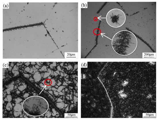 After prior heat treatment, the β grains are completely surrounded by the thin layers of alpha-phase (Figure 1b). But in Figure 7b–d, these layers break into individual flakes, which may be connected with the so-called complete, incomplete and pseudopartial wetting of grain boundaries by the second solid phase [11]. The morphology of grain boundary layers strongly influences the properties of Ti-alloys [12]. The grain boundary wetting transitions may influence the formation of PFZs.