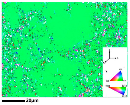 A huge amount of α phase precipitated both at the boundaries and inside the grains when the temperature dropped to 580 °C, as shown in Figure 5c. It is interesting to see that the precipitated α phase show a hierarchic structure. A network of α phase formed within the prior β grains, separating the β grains into cells of about 10–50 μm in diameter. The cell walls were constructed by interlaced thin α lamellae. In most cases, such heterogeneous precipitation of the secondary phase is caused by the substructures within the prior β grains. Thus, electron backscattered diffraction (EBSD) microscopy was employed to measure the grain orientation variation within prior β grains, as shown in Figure 6. It is clear that all the cells had the same orientation, i.e., there was no substructure within the prior β grains (The scatted points with other colors at the cell walls were the α phase). The formation of network structure will be discussed in Section 4.