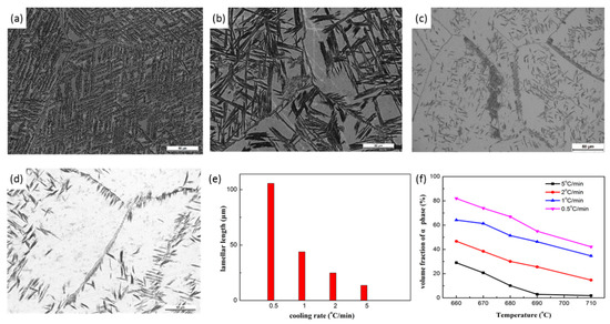Effect of the cooling rate on the nucleation and growth of the α phase. The specimens were cooled at (a) 0.5, (b) 1, (c) 2 and (d) 5 °C/min from 865 °C to 660 °C. The measured length and volume faction of the α phase are given in (e) and (f).