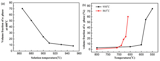 When the solution temperature is 860–910 °C, with the increasing solution temperature, the volume fraction of α phase is decreasing and the decreasing rate is high. When the solution temperature is above 910 °C, the volume fraction of α phase is decreasing with the increasing solution temperature and the decreasing rate is low. Thus, PFZs is prone to occurrence when the solution temperature is above 910 °C. The transformation kinetics given in Figure 8b suggested that the β-α transformation prevailed below 600 °C and finished at about 550 °C when the high solution temperature was applied. In fact, the temperature range in which rapid phase transformation occurs can be changed. An example is given in Figure 8b that the temperature range was 710–660 °C at the solution temperature of 865 °C. The PFZs can also be suppressed if phase transformation occurs at high temperature.