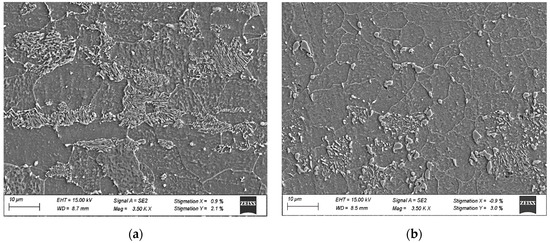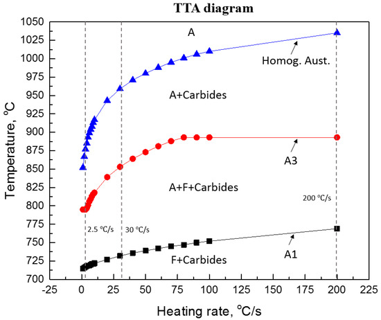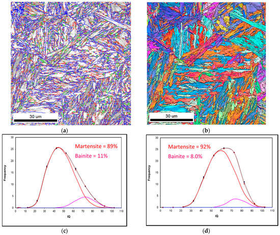 It is well-known that the transformation temperatures, AC1 and AC3, and the nucleation of austenite, are strongly affected by the heating rate. The effect of heating rates on the transformation temperatures can be calculated using a commercial thermodynamic software program J-MatPro (version 7 [11]), the results are presented in Figure 4. In this figure, according to the predictions of J-Mat Pro, it is shown that in order to obtain a fully homogeneous austenite transformation, the reheating temperature must be increased well above the AC3 temperature, especially at high heating rates. The formation of austenite is well-accepted to be a diffusion-controlled process, controlled by the slower diffusion process of interstitial elements, i.e., C, in austenite when compared to the diffusion rates in ferrite. Therefore, for heat treatments in the temperature range of 845 and 895 °C, or even at higher temperatures, i.e., 1000 °C, it would not be expected that austenite will transform into 100% martensite during fast quenching. This view is independent of heating rates (2.5, 30 and 200 °C/s) prior to austenite transformation. For example, Figure 5 shows the EBSD-IQ results of ferrite-pearlite samples reheated at 1000 °C using 2.5 and 200 °C/s heating rates respectively, with a holding time of 30 s prior to rapid quenching. The results shown on this figure clearly support the theoretical predictions that a fully martensitic microstructure can’t be obtained using slow or fast heating rates and short holding times at the supercritical temperatures. The resulting microstructure was a combination of martensite + bainite. This behavior can be explained by the effect of a heating rate and holding time on the nucleation and growth of austenite and the dissolution of Fe3C carbides. Several studies [12,13,14] have indicated that during rapid reheating the classical view of phase transformations will deviate markedly from those observed during equilibrium conditions. That is, the kinetics of transformation will have a different behavior. For example, faster heating rates favors nucleation of austenite, while slower heating rates leads to a significant growth of austenite. That is, slower heating rates permit C diffusion through the austenite, enabling its growth. An additional effect is the holding time at a given temperature, fast heating rates and short holding times, promotes substantial local compositional differences in austenite.