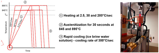 Schematic representation of the heat treatment cycles and photo of the laboratory CAL-induction simulator. TA3 is the transformation temperature.