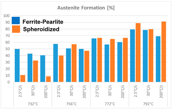 Figure 6 shows the volume fraction of austenite formed during intercritical annealing (in the temperature range 732 to 792 °C) as function of heating rate and initial microstructure at very short holding times, i.e., 30 s. The results shown in this figure seem to indicate the influence of the initial microstructure and heating rate on the kinetics of transformation. That is, in a ferrite-pearlite microstructure, slower heating rate leads to higher nucleation and growth of austenite formation compared to faster heating rates for a given intercritical annealing temperature. When the initial microstructure is ferrite-100%spheroidized Fe3C carbides, the formation of austenite doesn’t have a similar dependence on the heating rate. This might be related to the fact that in a fully spheroidized microstructure, not all the Fe3C particles nucleate austenite. The Fe3C carbides located at the ferrite grain boundaries nucleate austenite preferentially, while those Fe3C carbides located in the matrix do not contribute to the nucleation of austenite. These carbides dissolve and the carbon contributes to the growth of austenite. In summary, the kinetics of austenite formation in a ferrite-pearlite microstructure can proceed in one or two stages depending on the heating rate. The results shown in Figure 6 also seem to support the view that the formation of austenite from an initial ferrite-spheroidized Fe3C microstructure tend to exhibit lower kinetics of austenite transformation compared to ferrite-pearlite or fully martensitic starting microstructures [19,23,24].