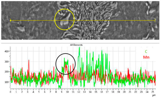 SEM-EDS line scan showing the segregation of C and Mn in the pearlite and Fe3C carbides.
