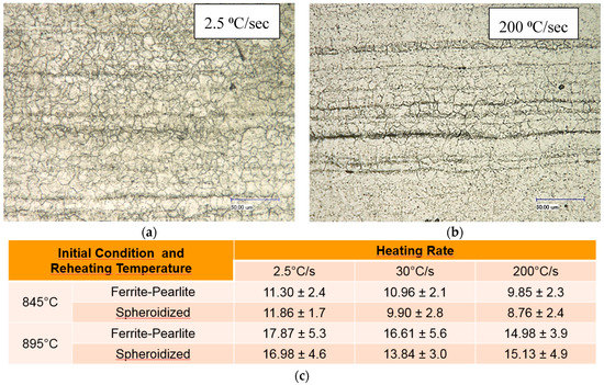 Average PAGS in µm as function of heating rate, reheating temperature and initial microstructural condition; (a) OM of PAGS from 845 °C and (b) 895 °C. While (c) shows the PAGS values.