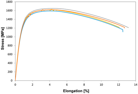 The tensile properties of a selected number of fully processed samples (ferrite-pearlite) from Figure 9 were tested and the resulting mechanical properties were evaluated, see Figure 10. As expected, the flow stress was continuous for all the samples tested. A comparison of the UTS shows that the samples reheated at 845 °C with a heating rate of 2.5 °C/s and those reheated using 30 °C/s exhibited a slightest difference in UTS value 1591 MPa versus 1648 MPa, respectively. This behavior can be explained by the increased amount of martensite + bainite and less Fe3C + MA in the overall microstructure observed in the samples after reheating at 30 °C/s compared to those reheated using 2.5 °C/s. Interestingly reheating at higher supercritical temperatures, i.e., 1000 °C, did not increase the mechanical properties, as can be seen in Table 2. In this table, the average mechanical properties of the ferrite-pearlite and spheroidized samples reheated at 845 °C and WQ (water quenched) are also shown for comparison purposes. The YS and UTS for both starting conditions were very similar, the total elongation of the spheroidized samples was slightly lower compared to that of the ferrite-pearlite samples. The explanation for this behavior could be that the presence of some undissolved Fe3C carbides acted as nucleation sites for the onset of the diffusive necking. Reheating at higher supercritical temperatures and fast cooling produces an increase in the percent of martensite, lower percent of bainite and the presence of Fe3C + MA was not observed, compare Figure 5 and Figure 9. These results are in strong agreement with the common knowledge that optimum microstructural combinations of martensite + bainite are stronger than 100% martensite.