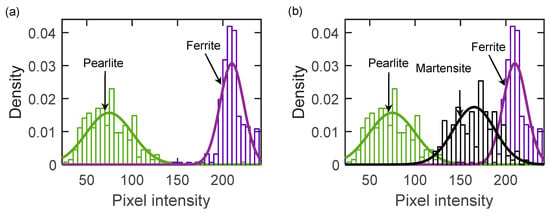 Probability density function of pixel intensities of metallurgical phases: (a) well-discriminated ferrite and pearlite phases, and (b) overlapped ferrite, pearlite, and martensite phases.