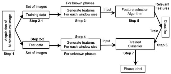 In the fourth step, the textural features of unknown metallurgical phases in the test images were evaluated using the same procedure described in the third step. These test images were selected from the 18 images that were present in the testing image set and not used for training purposes. However, in this step, every pixel of the test image was selected automatically by the MATLAB® code because the metallurgical phases of these pixels were unknown and should be classified into one of the known phases. The dataset generated in this step was called the test dataset. In the fifth step, feature selection was performed on the dataset to obtain the subset of the most relevant textural features. In the sixth step, the dataset consisting of only most relevant textural features was provided as input to the classifier chosen in this study, and the machine learning algorithm was trained. In the seventh and final step, the test dataset was given as input to the trained algorithm, and unknown phase labels were identified. The flowchart of this methodology is illustrated in Figure 3.