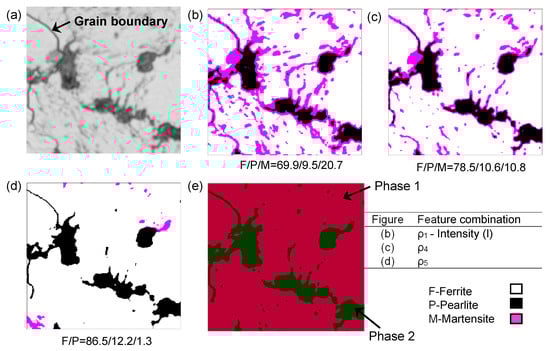 A numerical example illustrating the importance selecting the most relevant textural features: (a) original image, (b) only ‘pixel intensity’, (c) ‘pixel intensity’ and top 3 textural features, (d) ‘pixel intensity’ and top 4 textural features, and (e) segmentation in ImageJ. It is observed from subfigure (d) that the accuracy of classifying metallurgical phases has increased with the addition of more relevant textural features.