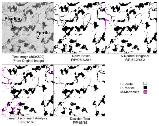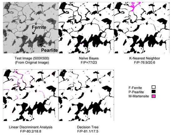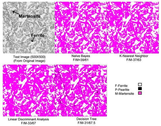 In this study, three different microstructural images were randomly chosen from the test image set to validate the proposed texture-based phase identification in a microstructure. These microstructural images corresponded to ASTM A36-500 air-cooled (500AC), ASTM A36-900 air-cooled (900AC), and ASTM A36-900 water-cooled (900WC) specimens, which are shown in Figure 6, Figure 7 and Figure 8. Textural features were extracted using the procedure explained in Section 4, which served as the test data. Based on the combinations of textural features and ideal window sizes provided in Table 9, the metallurgical phases of all three test images were identified, and they are shown in Figure 6, Figure 7 and Figure 8. In Figure 6, Figure 7 and Figure 8, all four classifiers were able to predict the metallurgical phases accurately for both air-cooled (ferrite–pearlite) (Figure 6 and Figure 7) and water-cooled (martensite and ferrite) microstructures (Figure 8). Besides the identification of metallurgical phases, the volume fractions of the phases were also evaluated for all four classifiers, and they are summarized in Table 10. The volume fractions of ferrite and pearlite predicted for (1) ASTM A36-500AC were 81.6% and 17.7%, respectively, and for (2) ASTM A36-900AC they were 78.8% and 19.8%, respectively. For the ASTM A36-900WC specimen, the volume fractions of ferrite and martensite were predicted to be 36% and 64%, respectively.