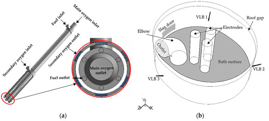 The computational domain is the gas phase above the molten bath surface around the electrodes, the fluid inside three VLBs located at the furnace wall and the elbow (Figure 1b). The enlarged domain of the fluid inside the VLB is shown in Figure 1b. The main oxygen is injected into the furnace through the central nozzle, and six secondary oxygen and six fuel jets are located around the main oxygen nozzle.
