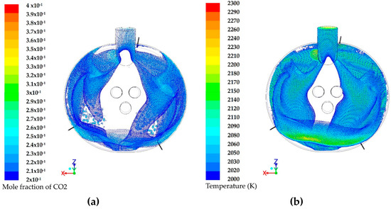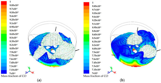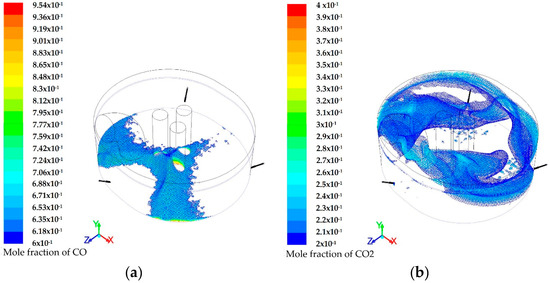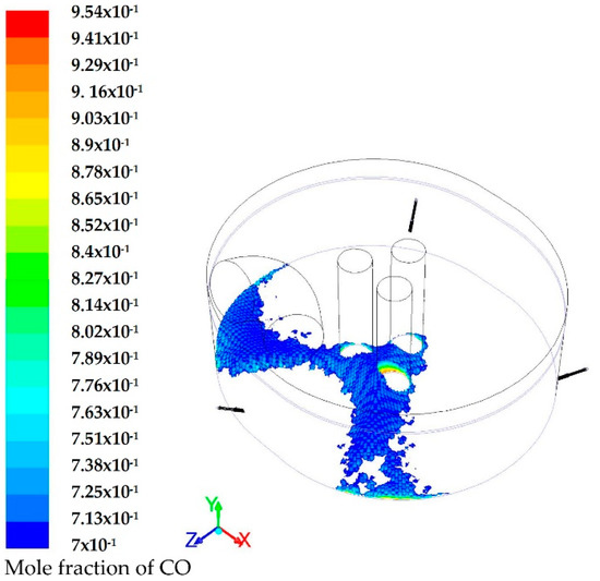 The high CO concentration region for case 4 in Table 11, with a secondary oxygen flow rate of 0.1 kg·s−1, is shown in Figure 8. This is obviously lower compared to case 1 in Table 11 due to the higher postcombustion ratio.