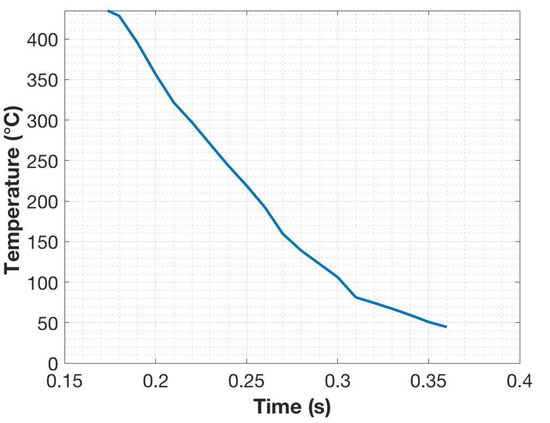 Thermocouple data obtained from the surface of the specimen during quenching of the steel after austenitizing with the Gleeble.