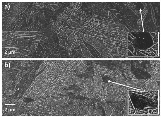 From the SEM micrographs in Figure 2, it can be seen that the martensite comprised both thin and thick laths with widths of around 0.5 µm and more than 1 µm, respectively. Such mixtures of coarse and fine laths are commonly found in as-quenched low-carbon steels, e.g., as shown by Morsdorf et al. [17,18], who suggested that the coarse laths are the first laths to form just below the Ms temperature, where the resistance to their growth into the austenite is small due to the effect of temperature on the strength of the austenite.