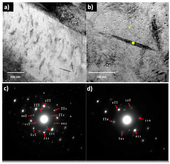The auto-tempered precipitates were resolved in the STEM/TEM images (Figure 3), which shows that the precipitates in a coarse martensite lath are plate-like or rod-like with a crystal structure consistent with that of orthorhombic cementite; see the nanobeam diffraction patterns from the precipitate and the matrix in Figure 3c,d. No epsilon or Hägg carbides were found to be present.