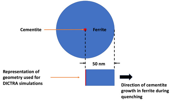 DICTRA [12] calculations were made to qualitatively explore the potential growth of cementite precipitating in the martensite formed at various stages of the quenching process and any subsequent hot-mounting. To avoid convergence errors, a binary Fe–0.126% C system was selected. This approximation should not amount to significant errors as the early growth of cementite is expected to occur without appreciable diffusion of substitutional alloys [20,21]. The validity of using the binary approximation was also checked by making some calculations for the ternary Fe–0.126% C–1.66 Mn system as shown below. The simulation was set up as a closed cylindrical cell as seen in Figure 4. From the TEM observations (Figure 3) the distance between the cementite precipitates was approximately 100 nm. Therefore, the cementite was assumed to grow from the center of a cell surrounded by a ferrite matrix of radius 50 nm. The ferrite matrix was considered as it was the most suitable representation of the martensitic phase in DICTRA. It was pointed out by Bhadeshia [22] that the lattice diffusion in body-centered tetragonal (bct) ferrite is predicted to be slower than body-centered cubic (bcc) ferrite. After the formation of a martensite lath, the ferrite lattice may change from bct to bcc due to auto-tempering. On the other hand, the high dislocation density of martensite should increase the rate of diffusion due to more pipe diffusion than in ferrite. For these reasons, the DICTRA calculations can only be considered approximate. The cell was then discretized into a geometric series with the points being denser near the interface of the ferrite matrix. The simulation was run using a trapezoidal integration method. The Thermo-Calc [12] thermodynamic database TCFE9 and mobility database MOBFE2 was utilized. The initial composition of the ferrite matrix was assumed to be uniform at 0.126 wt % C. Upper-bound growth calculations were made by assuming that the precipitates nucleated with zero incubation time as soon as the martensite lath was formed, irrespective of the temperature. The calculations assume diffusion-controlled growth, i.e., local equilibrium across the cementite–ferrite interface and capillarity effects were ignored.