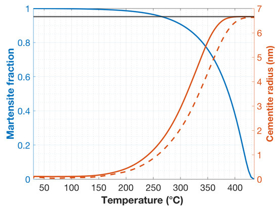 Martensite fraction vs. temperature, until room temperature, as shown with a blue line. The evolution was based on the Koistinen–Marburger equation in combination with electron probe microanalyses of local chemical compositions. The methodology is explained in Ramesh Babu et al. [13]. The predicted upper-bound radius of cementite precipitated in martensite laths formed at various temperatures through the quenching process is shown with orange lines. The solid orange line represents the radius of cementite near center of the specimen where the cooling rate was about 1000 °C/s. The dashed orange line represents the radius of cementite formed near the edge of the specimen where the cooling rate was about 2000 °C/s. The black line represents the predicted radius of cementite after the hot-mounting stage.