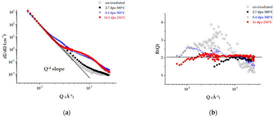 Nuclear SANS cross sections (a) and R(Q) (b) for un-irradiated reference Eurofer97 (empty circles) and for Eurofer97 irradiated 2.7 dpa 300 °C (squares), 8.4 dpa 300 °C (crosses), 16.3 dpa 250 °C (full circles); experimental results from References [10,14].