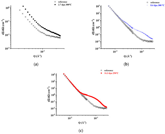 A small but well detectable increase in the SANS cross-section is observed after irradiation to 2.5 dpa. In the same Q range, for the samples irradiated to 8.4 dpa and 16.3 dpa the increase in SANS cross-section is one order of magnitude higher. Furthermore, the wider Q range available for the measurements of these two samples shows that for approximately Q < 10−2 Å−1 their cross-sections are nearly coincident with one of the reference samples and all follow a Q−4 behavior (“Porod law” [15,16], see also Figure 4a), determined by defects with sizes outside the experimental Q window: this behavior is attributed to carbide precipitates larger than approximately 500 Å, generally not affected by irradiation for such temperatures and dose levels [25]. As shown in Figure 4b, for the three irradiated samples the R(Q) ratio is close to 2 and within the experimental uncertainties introduced by combining the nuclear and nuclear plus magnetic SANS cross-sections as indicated in Equation (2). The slightly higher R(Q) value measured for the sample irradiated to 8.4 dpa around approximately Q = 2.5 × 10−2 Å−1, in correspondence to the small “bump” visible in Figure 4a and Figure 5b, could be attributed to the presence of a different kind of defect.