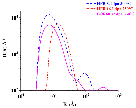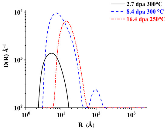 The distributions obtained for these three samples after reference subtraction are compared in Figure 9; Table 1 lists the obtained average radii and volume fractions. The uncertainty bands visible in Figure 6, Figure 7 and Figure 8 and the corresponding errors on the values of Table 1 are smaller than 10%. These errors result from the best fits obtained under the assumptions described here above. An estimate of the uncertainties resulting from different methodological assumptions and choice of the fitting parameters is provided for example by the comparison with the distributions previously obtained for these same samples [14]. Consistently higher values of volume fraction and lower values of average radii had been obtained with the already mentioned larger error bands and unphysical oscillations (Figure 2 in Reference [14]): in fact in the previous works, the cross-section considered for the fit was not solely determined by the effect of the irradiation, but partly contaminated by the spurious effects described here above. Furthermore, the previous SANS data analysis lead to some incorrect conclusions about the shape of the distributions, appearing bi-modal as particularly evident in Figure 4 of Reference [11], with no change in the average radii; however, this result was obtained because spurious effects related to the background noise and asymptotic contribution of large carbide precipitates were included in the fit. On the contrary, genuine information on the irradiation effects is provided by the new distributions presented in this paper, summarized in Figure 9. They are mono-disperse and the micro-void radius increases with the dose. In fact, after subtraction of the reference samples, an average radius of 4.4 Å is found for 2.7 dpa, 6.6 Å for 8.4 dpa, and 12.9 Å for 16.3 dpa. Furthermore, the previous SANS data analysis did not allow any clear conclusion on the effect of subtracting the reference sample’s cross-section nor a reliable determination of the average radii, while the volume fractions were overestimated. These problems are solved by the new data analysis presented in this paper and summarized in Table 1.