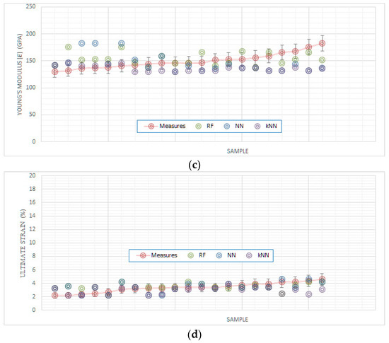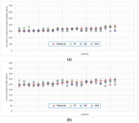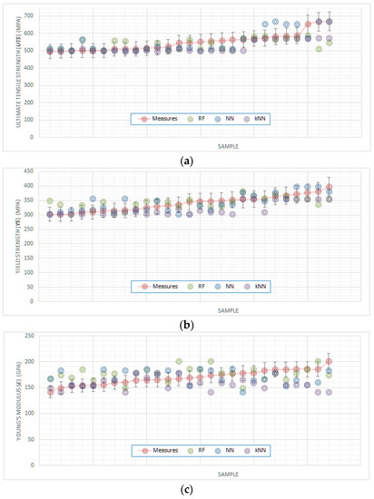 In particular, the four diagrams in Figure 1 show these tensile properties in the case of SGI where the values from the measures are reported together with error bars representing the related variability. In addition, all the diagrams are displayed with a y-scale ranging from 0 to (approx.) the maximum value. These provide a visual representation of the ability of the ML methods to fit the experimental values. For instance, in the case of UTS, it is possible to see how the largest part of the predictions (specifically 69 on 27 × 3 = 81) falls inside the error bars (±9%). These error bars were evaluated starting from the experimental measures and passing by their relative standard deviation (σ%). Per each property and each material, a specific σ% can be defined and this percentage can be used for dimensioning the error bar. The related bars are intended to give an idea of the variability of the measures, showing at the same time how a large part of the predictions falls inside this variability.