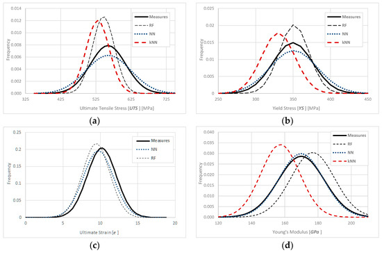 Metallurgical properties ((a) Ultimate Tensile Strength (UTS), (b) Yield Strength (YS), (c) Ultimate Strain (ε), (d) Young’s modulus (E)) in the case of Spheroidal Graphite Iron (SGI), as measured and predicted.