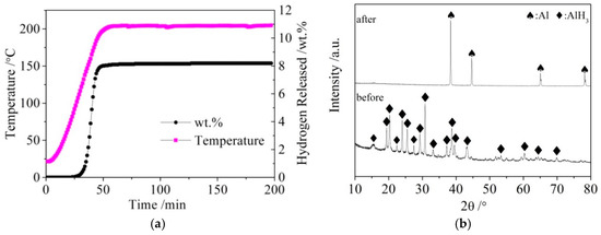 The LiBH4 powder (95% purity; Acros Organics) and Al powder (99% purity; Sinopharm Group) were employed as raw materials. AlH3 was synthesized as follows: LiAlH4 and AlCl3 were dissolved in diethyl ether at a molar ratio of 3:1. After the reaction (1) was fully carried out, the precipitate LiCl was filtered off, and the filtrate containing AlH3 was separated from the mixture. Pure AlH3 was then obtained from the filtrate by drying and de-ethering in vacuum. Finally, AlH3 was completely dehydrogenated to obtain active Al* by heating to 200 °C and holding for 2.5 h. The dehydrogenation curves of AlH3 and X-ray diffraction (XRD) patterns of AlH3 before and after dehydrogenation are shown in Figure 1a,b, respectively.