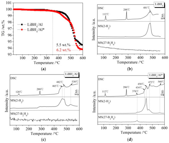 The DSC/MS curves of LiBH4, LiBH4/Al, and LiBH4/Al* are displayed in Figure 3b–d, respectively. The endothermic peak in the DSC curve of pure LiBH4 at 112 °C corresponds to the crystal transformation from an orthorhombic phase (o-LiBH4) to a hexagonal phase (h-LiBH4), while the endothermic peak at 288 °C corresponds to the melting of h-LiBH4 [28]. LiBH4 is dehydrogenated in the temperature range of 400 to 550 °C, and the dehydrogenation rate reached a maximum at 481 °C according to Figure 3b. Therefore, the endothermic peak at this temperature is ascribed to the decomposition of LiBH4 based on Reaction (2).