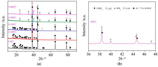 XRD patterns (a) of the LiBH4/Al* sample obtained at different temperatures (room temperature, 100, 350, 500, and 600 °C) and expanded XRD pattern of LiBH4/Al* sample of 600 °C at a 2θ range of 36–48° (b).