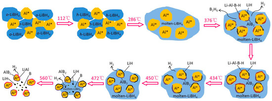 The whole hydrogen desorption process of the LiBH4/Al* sample, which is schematically shown in Figure 6, can be concluded as follows: While heating in the crucible, LiBH4 first transformed from an orthorhombic phase (o-LiBH4) to a hexagonal phase (h-LiBH4) at 112 °C and melted at 288 °C. Then, the molten LiBH4 reacted with Al* to form LiH, AlB2, and “Li-Al-B-H” compounds while releasing B2H6 and H2 based on Reaction (5) at 376 °C. As the LiH, AlB2, and “Li-Al-B-H” compounds were supposed to nucleate and grow on the surface of Al*, the reaction stopped when Al* was completely wrapped by these reaction products to form a passivation shell. When the temperature rose to 434 °C, the decomposition of the “Li-Al-B-H” compounds liberated a certain amount of H2, and the encapsulated Al* exposed some new surfaces. Thus, the main dehydrogenation reaction of LiBH4 and Al* occurred at 450 °C to form LiH, AlB2, and H2 based on reaction (3). Similarly, the reaction stopped when the surface of Al* was completely wrapped by LiH and AlB2. Therefore, the excess molten LiBH4 underwent self-decomposition to form LiH, B, and H2 (Reaction (2)) at 472 °C. That boron (B) was not detected in the XRD examination may be because B was in the amorphous state. Finally, the product LiH reacted with Al* to form LiAl alloy and H2 based on Reaction (4) when the sample was heated to 560 °C. The actual dehydrogenation amount of the LiBH4/Al* sample did not reach the theoretical value since there were still uncontacted and unreacted LiH and Al* at 600 °C.