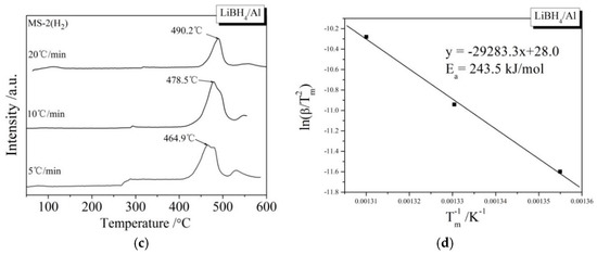 MS curves (a,c) of LiBH4/Al* and LiBH4/Al samples at different heating rates (5, 10, and 20 °C/min) and Kissinger spectra (b,d) of the main dehydrogenation reaction of the LiBH4/Al* and LiBH4/Al samples.