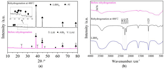 The rehydrogenation mechanism exploration was conducted using XRD and FTIR analysis of the rehydrided products of the LiBH4/Al* sample, and the results are shown in Figure 9a,b, respectively. It can be seen from the XRD patterns that the diffraction peaks of LiAl, LiH, and AlB2 disappeared, while the diffraction peaks of LiBH4 reappeared, and the diffraction intensity of Al increased after rehydrogenation. Furthermore, the vibrational peaks of B–H stretching (2382, 2292, and 2224 cm−1) and bending (1125 cm−1) were also detected in the FTIR spectra. Therefore, the re-formation of LiBH4 can be confirmed during the rehydrogenation process. Based on the above analysis, it can be safely concluded that the rehydrogenation process of LiBH4/Al* is based on Reaction (7).