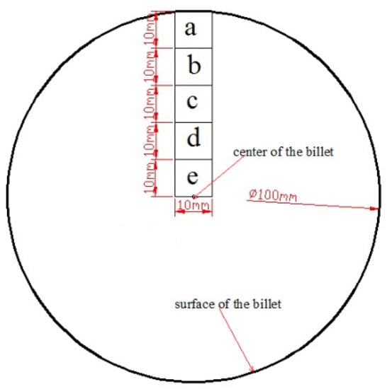 Molten steel was poured into a Φ 100 mm × 300 mm sand mold to obtain M2 steel ingot and samples were obtained at one-third of ingot height. The test vertical continuous caster consists of four zones, namely, mold section, foot roll section, secondary cooling Section 1 and secondary cooling Section 2, with length of 400 mm, 80 mm, 140 mm and 240 mm, respectively. The length of the continuous casting billet obtained from the test is 1.2 m. A 10 mm thick slice was taken along the cross-section in the middle of continuous casting billet, five samples were obtained every 10 mm in turn from the edge to the center of the slice for continuous billet and sand mold ingot, respectively, the sampling method is shown in Figure 1.