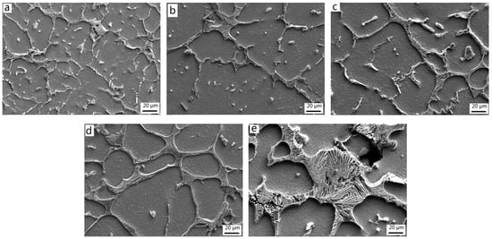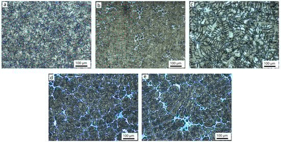Microstructure (×100) of the different samples from the M2 steel billet cast in the sand mold (a–e for the billet from edge to center).