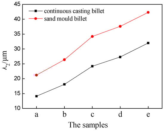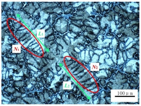 The lengths of the dendrites (Li) were measured with MIAPS. The number of the secondary dendrite arms (Ni) of every dendrite was counted. The statistical process is shown in Figure 4. The λ2 values of different samples of the billets can be calculated by Equation (3). The computed results are shown in Figure 5. Carrying the calculation results of Figure 4 into Equation (2), the cooling rate of each sample can be obtained. The cooling rates of each sample are shown in Figure 6.
