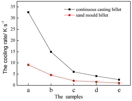 From Figure 13 and Equation (7), it can be seen that the increase in the cooling rate and the grain size decreases. The relationship of the cooling rate and grain size is non-linear. When the cooling rate is low, a small increase in the cooling rate can lead to a significant decrease in the grain size. When the cooling rate is large and continues to increase, the decrease in the grain size is not particularly evident. Based on Figure 6, the cooling rates in the center of the continuous casting billet and sand mold billet are 2.52 K·s−1 and 1.05 K·s−1, respectively. From Figure 12, the grain size decreases from 91.6 μm to 68.2 μm, respectively, which indicates a reduction of 25.5%. Thus, an appropriate increase in the cooling rate can effectively reduce the grain size in the center of the M2 steel billet.