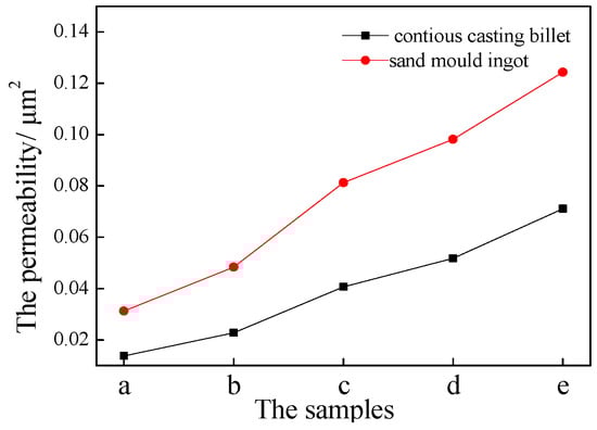From Equation (6), it can be seen that permeability is proportional to the square of λ2. An increase in λ2 increases the permeability, which improves the liquidity of the solute enriched liquid; this situation causes substantial center segregation. The permeability at the corresponding sample can be calculated by Equation (6) on the basis of the measured results of λ2 in different samples from the M2 steel billet in Figure 5 and the results are shown in Figure 7.