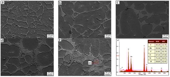 To verify the theory above, the carbide phase in the samples from the two billets was extracted using MIAPS, as shown in Figure 8 and Figure 9, the composition of e1 position was determined by scanning electron microscopy and was determined to be carbide, as shown in Figure 8e1. The carbide phase area fraction was counted. The result is shown in Figure 10.