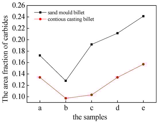 As shown in Figure 10, it can also be seen that the carbide area fraction in the (b) sample is the lowest of the two billets. This is because the cooling rate in the (a) sample was large, which led to a low λ2, which indicates that the permeability was small. The solute enriched liquid in the (a) sample cannot flow to the (b) sample. When the solidification front moved to the (b) sample, the cooling rate decreased and the λ2 and the permeability increased. The solute enriched liquid in the (b) sample can flow to sample (c), so the carbide area fraction in the (b) sample is the lowest. The liquidity of the solute-enriched liquid of the (a) sample in the continuous casting billet was obstructed effectively and the obstruction effect was better than that of the sand mold billet.
