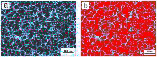 Grain size statistical analysis result: (a) original microstructure (×100) and (b) microstructure (×100) after processing.