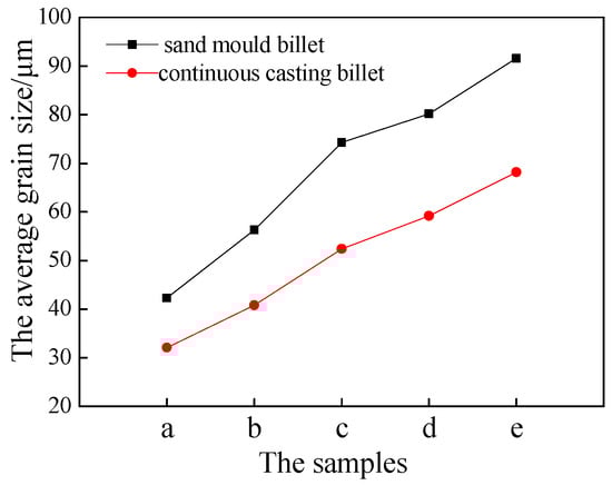 Figure 12 shows that the grain sizes in the continuous casting billet are smaller than those in the sand mold billet. The average grain size of the sand mold billet is approximately 69.4 μm, while the average grain size of the continuous casting billet is approximately 50.54 μm. Compared with that of the sand mold billet, the average grain size of the continuous casting billet is reduced by approximately 26.7%. The grain size of the samples increased by 2.12 times from the edge to center in the continuous casting billet and it increased by 2.16 times in the sand mold billet. The continuous casting process can effectively refine the grain size but it did not have a distinct effect on the grain distribution uniformity.