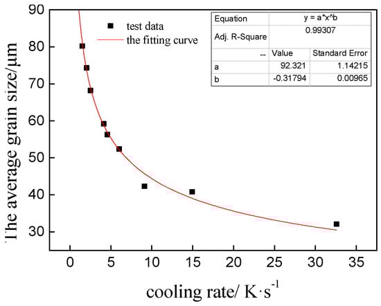 The analysis above shows that as the cooling rate increases, the grain size is reduced. There is almost a one-to-one correlation between the cooling rate and grain size in the M2 steel. According to the cooling rates of the samples in Figure 6 and the grain size of the samples in Figure 12, the relationship between cooling rates and grain sizes of M2 steel during the solidification process can be obtained, as shown in Figure 13. Then, the data from Figure 13 can be fit using Equation (7) as follows: