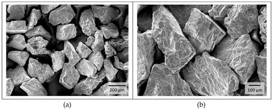 Characterization of the titanium powder morphology. (a) particle size: d = 125–335 µm; (b) the coarse, sharp-edged and blocky structure.