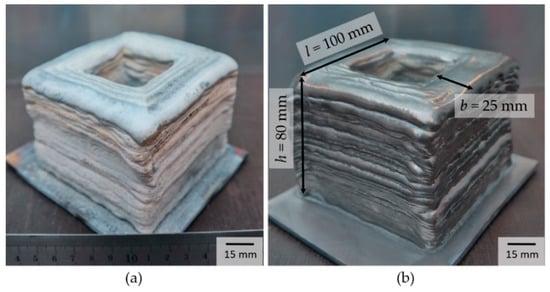 The total production time of the component was 5 h and 40 min. This results from the proportion of pure processing time with 4 h and 5 min and a set-up time of 1 h and 35 min. The additively manufactured component is shown in Figure 3. After the building process, the component was covered with a thin, non-firmly-attached white oxide layer (see Figure 3a). This oxide layer can be removed completely from the surface by subsequent brushing (see Figure 3b). Process observations have shown that the oxide layer is not formed until the following layer is deposited. The oxide formation on previously deposited layers is caused by heat dissipation induced by the build of layers above. However, the building space itself is very well protected from the atmosphere.