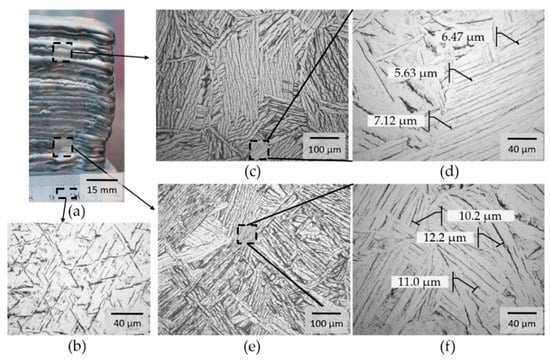 The evolution of the microstructure in the component is shown in Figure 4. In comparison to the typical basket-weave α + β structure of the building platform consisting of Ti6Al4V (see Figure 4b), the additively manufactured component is characterized by a structure of alpha laths (see Figure 4c,e). Furthermore, it was found that the width of the alpha laths decreases with increasing component height. The layer-by-layer build process leads to repeated heat input into the previous layers. The associated longer cooling times of the bottom layers lead to increased growth of the lattice structure. In the lower area, the average width of the alpha laths is 11.13 µm (see Figure 4f). In the upper area, an average width of 6.4 µm was determined. This microstructural evolution is very similar to the evolution during a heat treatment, such as annealing or stress relieving [,].