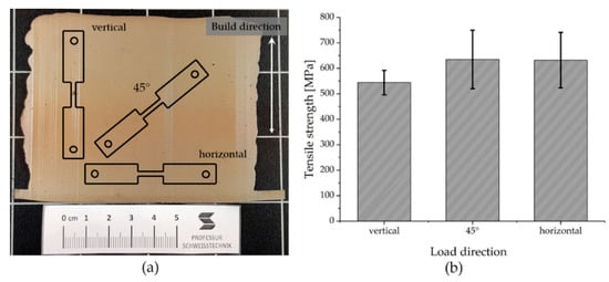 The orientation of the micro tensile specimens within the part is sketched in Figure 5a. The results of the micro tensile tests regarding the influence of the loading direction in relation to the build direction are shown in Figure 5b. In total, three tensile tests per position were performed.