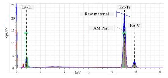 However, it should be noted that all tensile tests carried out in as-welded condition show brittle behavior with an average fracture elongation of A = 0.8%. The lack of ductility and the increased strength values can be explained by an increase in the oxygen level of 0.68 wt.% in the finished AM-part determined by inert gas fusion (Table 1) [,]. The uptake of ambient oxygen due to the open chamber characteristic of the welding fixture is probably the main cause of the higher oxygen content. Through the identification of elements in the manufactured part via EDXS measurements further process-related impurities have been excluded, see Figure 6. The display for the element vanadium is below the determination limit and can be neglected.